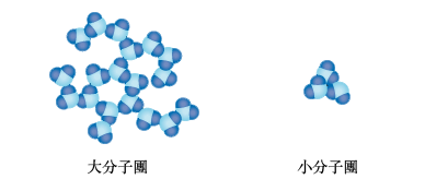 那麼,怎樣的水有助於促進體內循環呢?水聚合了H2O的分子,形成了分子團。「分子團」有「葡萄串」的意思,聚合了較多H2O的單分子組成的分子團被稱為「大分子團」,聚合較少的分子團被稱為「小分子團」。