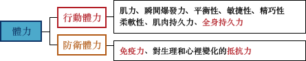 經常會說有體力或沒有體力,那麼體力到底是怎麼回事呢?體力是像下表一樣整體把握人的生命維持力的概念,現在人們多以充實防衛體力,提高行動體力為目標。最近,普遍認為即使在行動體力中,全身持久力高也會對生命維持起著重要的作用。全身持久力高的話,呼吸循環器官系統(心臟機能)和內分泌系統(荷爾蒙)等機能會越出眾。